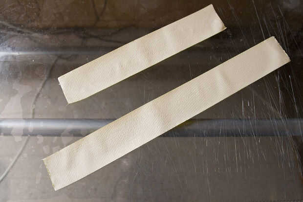 Tomar dos tiras de cinta, el corto uno debe ser justo lo suficiente para envolver alrededor de la parte superior del pie, el otro un poco más para pegarse a la espuma de poliestireno.