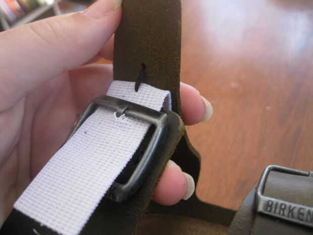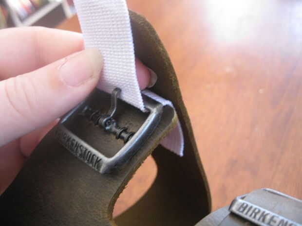 Meta el elástico con la hebilla, como si fuese la correa original. Recortar para que no cuelgue hacia fuera demasiado. La cinta original se basa sobre la hebilla.