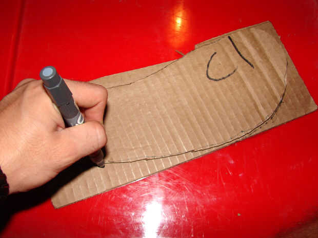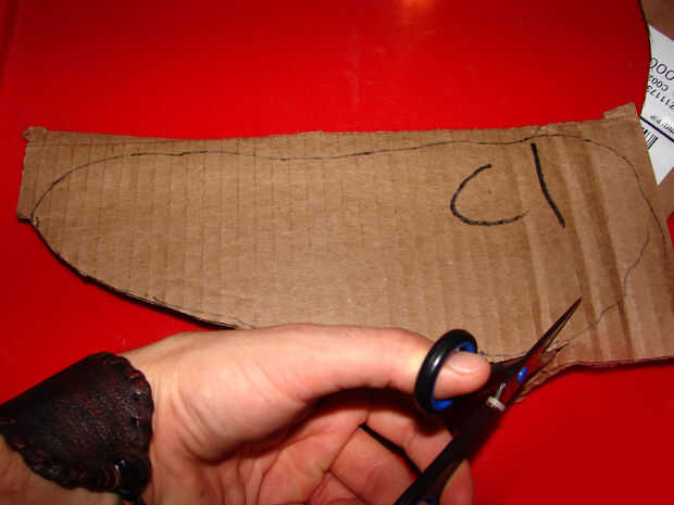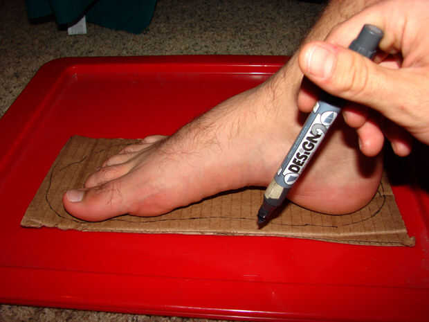 Empezar por cortar la caja de cartón de paneles planos. Entonces su pie desnudo sobre una hoja de cartulina y trace una línea alrededor de su pie cerca de 1/4 a 1/2 pulgada hacia fuera de la suela y redondear los dedos del pie. Después de eso, use un utensilio de corte para cortar el esquema inicial y a continuación traza tres réplicas en la cartulina restante. Cortar las suelas de cartón restantes cada planta constará de dos recortes de cartón.