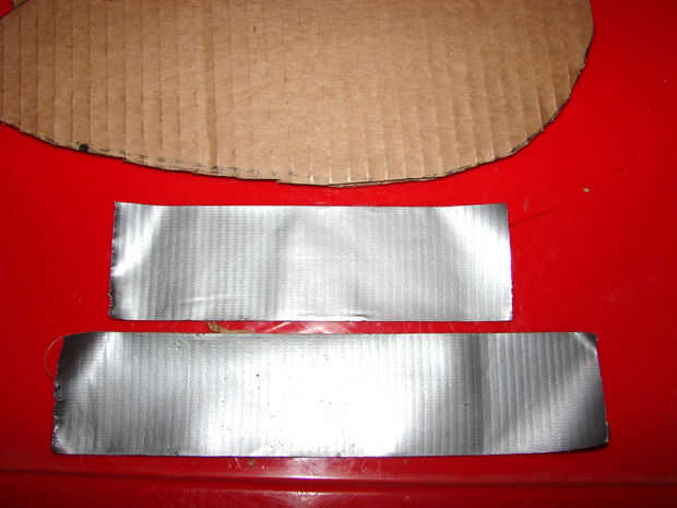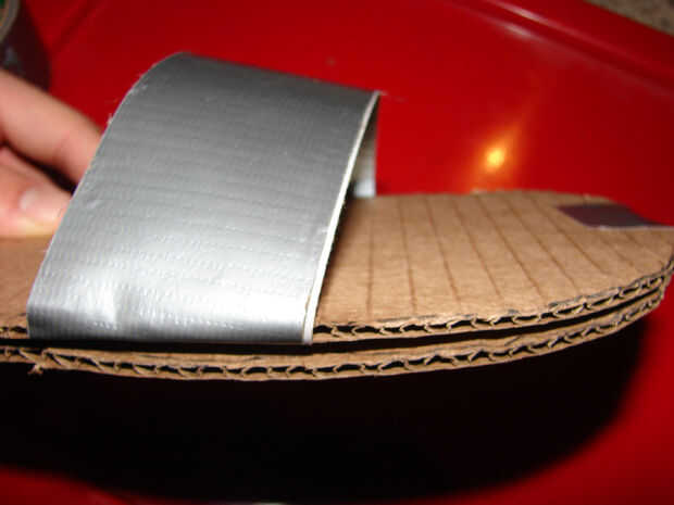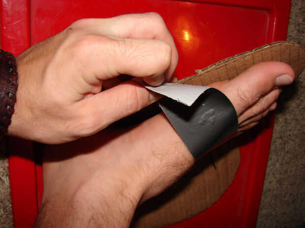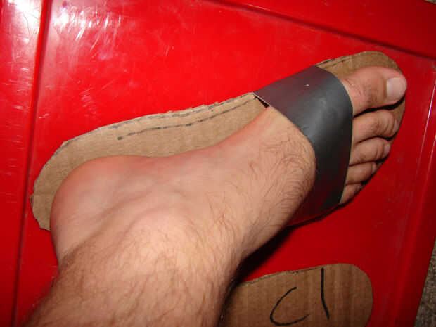 Ahora que tienes la base de la planta del pie su tiempo para hacer la correa. Para cada sandalia arrancar una tira de cinta adhesiva para conductos de 8 pulgadas de largo y otra tira de 6 pulgadas de largo (las longitudes pueden variar según el ancho de tu pie para que un gobernante no debería ser necesario a menos que su exigente). Coloque el lado adhesivo de la tira de 8 pulgadas para arriba y coloque la tira de 6 pulgadas sobre él para que sólo los extremos tienen adhesivo mostrando (no omitir esto especialmente para aquellos con pies peludos o descubrirás una nueva forma de la cera). Ahora, coloque el pie en una de las plantas de cartón (use solamente una capa para que la correa se ajusta entre las capas de cartón) y fije la correa de cinta de conducto que acaba de realizar sobre la parte superior del pie justo antes de los dedos del pie apretados bastante así que wont resbalón mientras que usar y lo suficientemente suelta para fácilmente deslizar y apagar. Los extremos adhesivo deben pegarse a la parte inferior de la planta del pie. Repita el paso para el otro pie.
