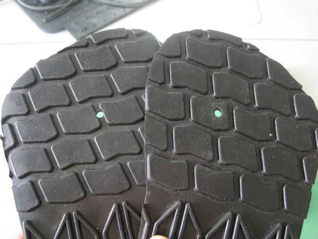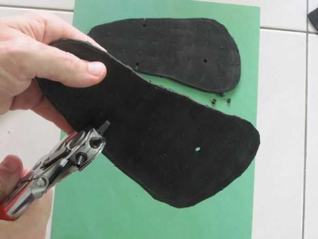 Ahora es el momento para azotar hacia fuera su golpe de cuero (o clavo oxidado) y poner los agujeros en tus sandalias! Es bastante autoexplicativo. Una vez más, si tú mismo diste material adicional, asegúrese de que perfora dentro de las líneas de lápiz de la plantilla de papel para un mejor ajuste.