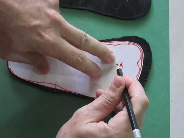 Después de que han cortado sus soles, vuelva a colocar la plantilla y transferencia donde deben ir los agujeros. Para los orificios laterales, marcarlos dentro lo suficiente para que haya una cantidad suficiente de material en el exterior para evitar desgarros. Si usted intencionalmente cortar sandalias ancho en los lados, poner las marcas para los agujeros dentro de las líneas de la plantilla original de papel; de lo contrario, el pie se deslice alrededor en la sandalia.