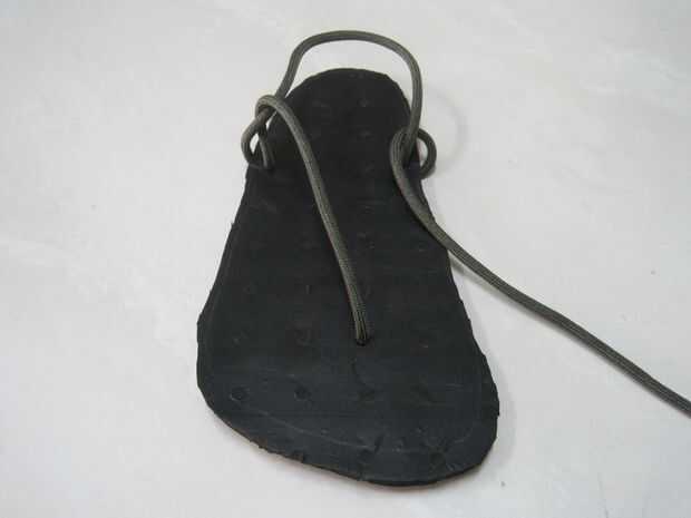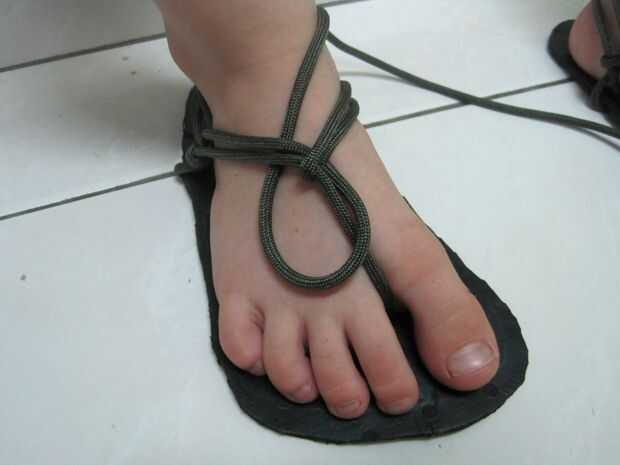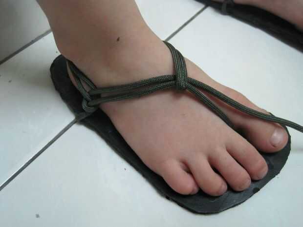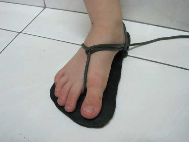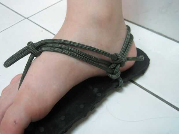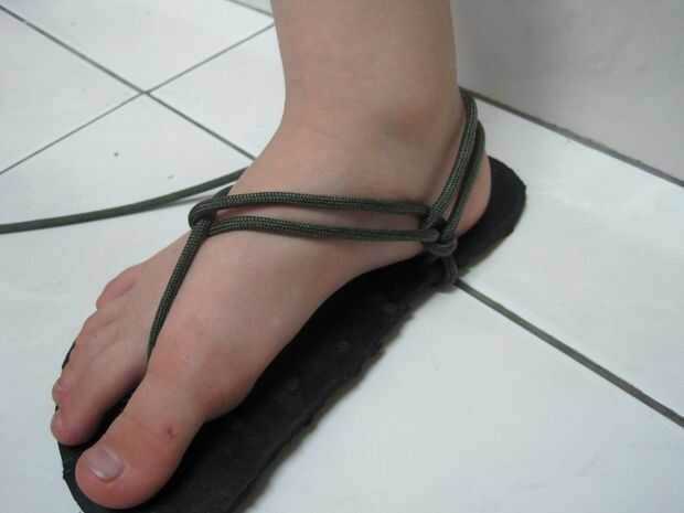 En primer lugar, preparar una longitud de 6 pies de paracord (5' para los niños, como en este Instructable) por la fusión de los extremos ligeramente y pellizcar ellos mientras todavía caliente, para facilitar la puesta a través de los agujeros. Utilice pinzas si eres propenso a chisporrotear los dedos. Ahora poner un extremo por la parte superior del agujero del dedo del pie y su nudo favorito en la parte inferior (en la foto es una figura de ocho).