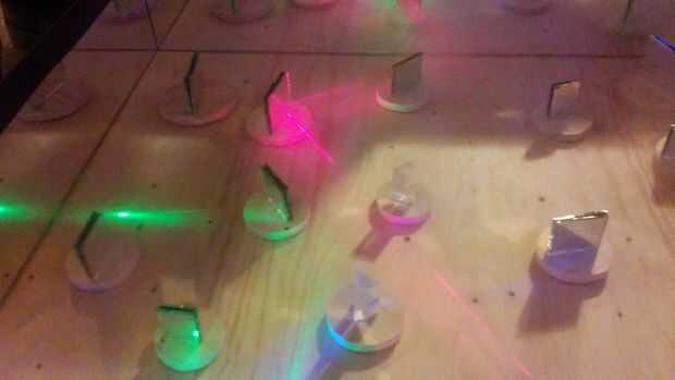 Donde el arte se encuentra con la física: colorido, láser de rotación de espejos, prismas, reflejos, niebla, motores eléctricos.