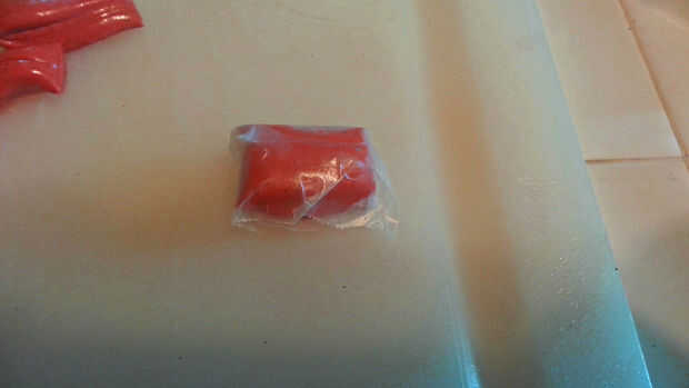 Coloque un pedazo de chicloso a lo largo del borde inferior de centro de un cuadrado de papel de cera. Rodillo en la parte superior y entonces doble o retuerza los extremos para cerrar bien.