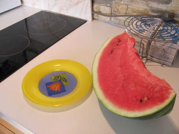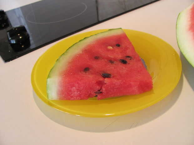 Lavar y cortar la sandía, quitar la corteza. Que las piezas son el tamaño y el grosor adecuado para la parrilla.