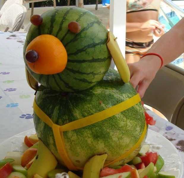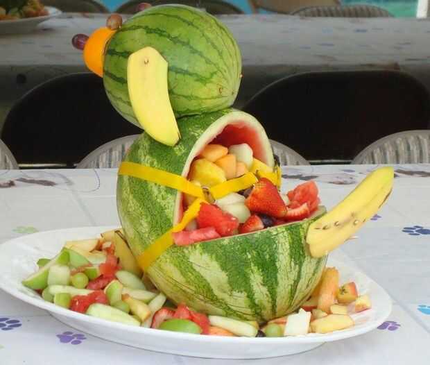 Hice esto hace unos años y han hecho unos cuantos diferentes desde, pediría a los niños qué animal les gustaría para los cumpleaños allí y esculpir utilizando principalmente sandías y otras frutas donde en temporada. Desde que hice este hace rato no tengo fotos del proceso.
