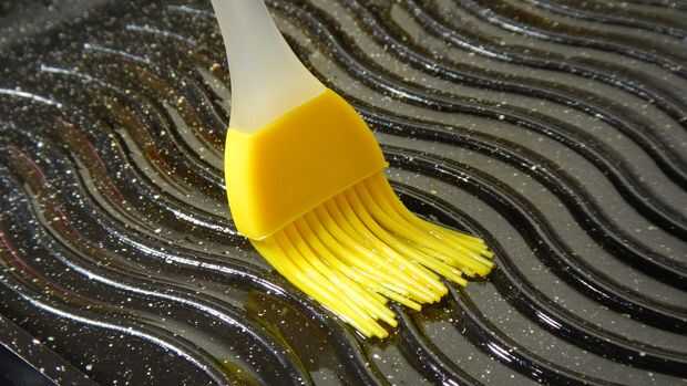 Calentar la sartén y añadir unas gotas de aceite de cocción/fritura. Recuerde que he utilizado mucho en el video, tan solo unas gotas no más. Sandía está llena de agua así que es muy difícil de quemar. Extienda el aceite uniformemente sobre el sartén, puede utilizar un cepillo para obtener fina capa uniforme de aceite.