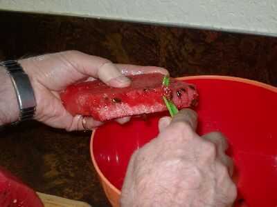 La carne sabrosa que rasque no se pierde, como gotas en el recipiente de la semilla. Al final del proceso, usted será puré los trozos sobrantes, semillas y todo, a través de un tamiz o un dibujo, representar un vaso de jugo de sandía dulce.
