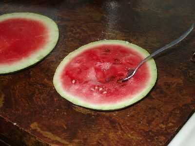 Compartir con los niños, o tus amigos (o cerdo todo por sí mismo) los tazones de fuente de sandía se corta desde los extremos del melón al principio. Las pocas semillas que encuentra y escupa hacia fuera a hacen la carne dulce, roja que mucho más sabroso!