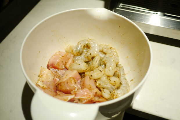 • Antes de cocinar los cubos de pescado y camarones en brochetas para que sea más fácil de manejar en la parrilla.
