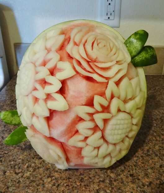También se incluyen algunas fotos de otras sandías que he tallado. Si este Instructables golpea bien y hay interés para él, seré feliz de crear más mostrando otros métodos tales como tallar las rosas vistas en mis otras fotos y otras cosas!