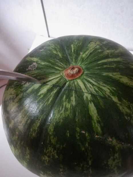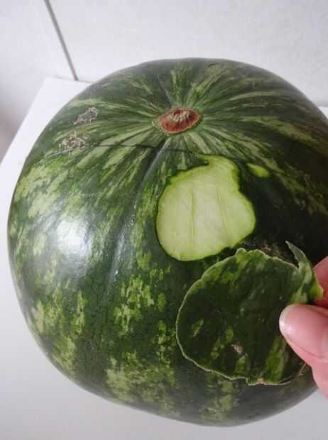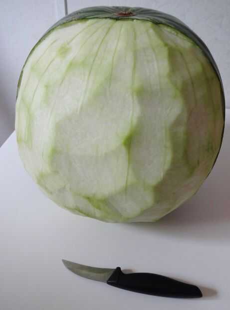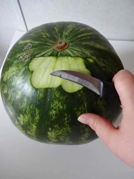 Iniciar con su cuchillo de cocina para trazar un círculo en el lado de la sandía quiere tallar. Una vez que han cortado una plantilla de círculo para seguir, utilice el cuchillo de cocina para Retire la parte verde de la corteza de la sandía, dejando la parte blanca carnosa expuesta.