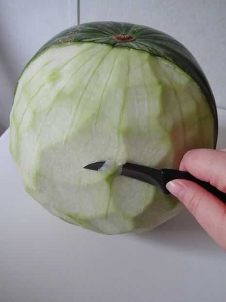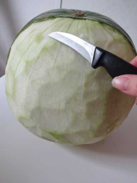 Después de pelar lejos los bits verdes, verás que hay partes más oscuras de la piel que usted podría haber perdido debido a la desigual corte. No hay problema, sólo coge el cuchillo de cocina y limpiar de peeling lejos tanto del verdoso para colorear como sea posible hasta que la corteza blanco sólo está mostrando. No tiene que ser perfecto pero para no pasar horas en él o que terminan talla lejos toda la parte blanca y golpear la fruta en su lugar!