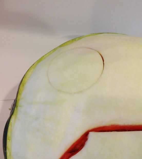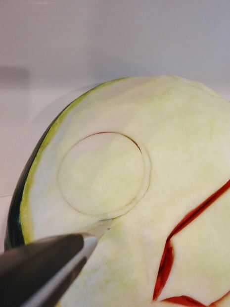 Para comenzar el girasol, coge el cortador de la galleta de su círculo y presione suavemente en la sandía, no más que 1/3 del cortador de galletas en. No cortar formas, hacer un esquema a seguir. Después de cortar el círculo, usar el cuchillo de cocina para cortar un anillo alrededor del círculo y algunos de la sandía alrededor de él, haciendo que parezca 3D más labrar.