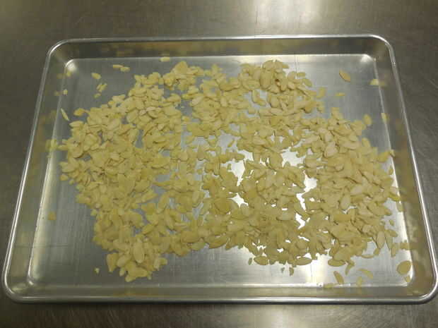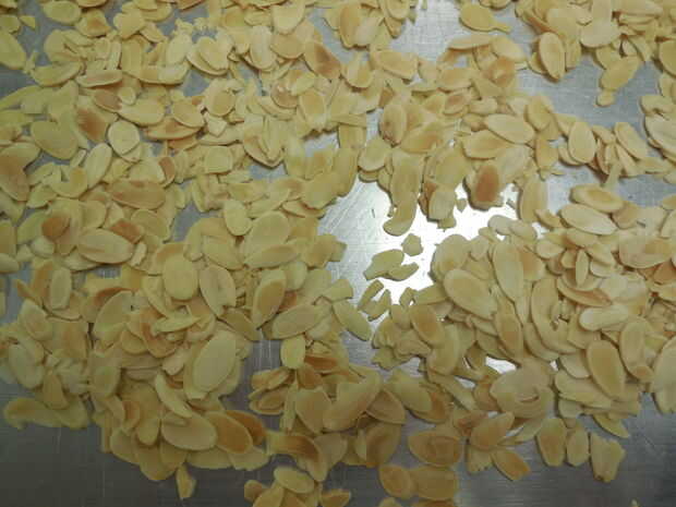 Extiende aproximadamente una taza de almendras fileteadas uniformemente en una bandeja de hoja y hornear en horno precalentado 350 grados