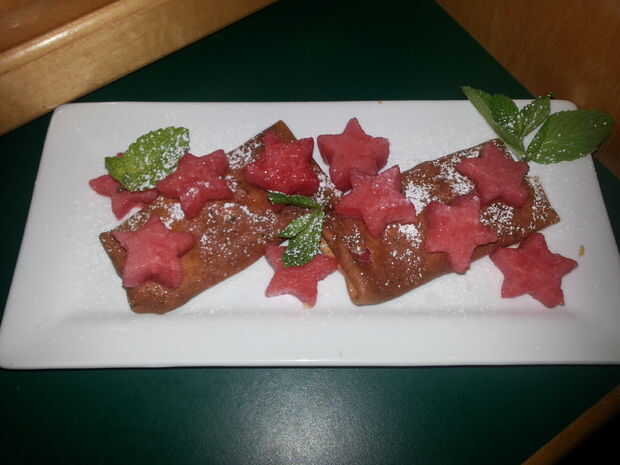 En un tazón grande, combine todos los ingredientes (excepto la sandía) listados y mezclar suavemente. Coloca un crepe en un plato y coloque una pequeña cantidad de sandía a lo largo del centro. A continuación colocar unas cucharadas de la mezcla de queso de perifollo encima de sandía. Doble cada uno cada lado del relleno. Espolvorear con azúcar con alimentación si se desea. Puede colocar unos estrellas forma corte los trozos de sandía en la parte superior y decorar con menta.