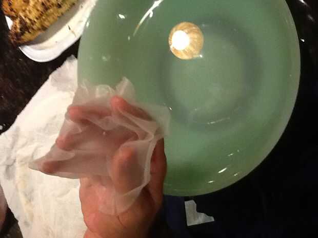 Una hoja de papel de arroz y un tazón de agua listo. PLOP el papel de arroz en el recipiente de agua durante unos 30 segundos, o hasta que esté delgada y flexible. Una vez completo, debe ahora suavemente colocar el papel de arroz en un plato tan plano como sea posible.
