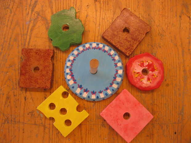 Cuando todas las opciones de sandwich han sido pintadas, incluyendo la placa, cubren el trabajo con una capa de poliuretano. Me gusta usar minwax, su no tóxico (por si acaso alguien trata de morder su sándwich) y es soluble en agua, ideal para fácil limpieza.