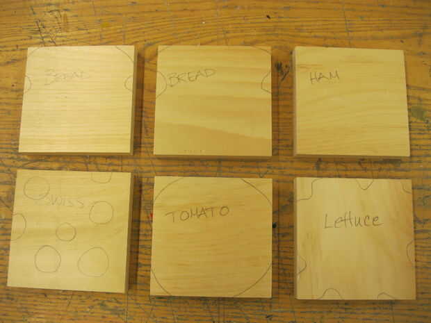 dibujar sobre la madera una guía para cortar. ¿Dos rebanadas de pan, tal vez carne, queso (Suiza es divertido debido a los orificios, algo redondo, un tomate? una cebolla? una hamburguesa? Quiero que mis alumnos para trabajar en al menos una forma redonda. La lechuga es una necesidad porque la Sierra de marquetería es una sierra caladora de mano y alentarlos a maniobra de varias formas.