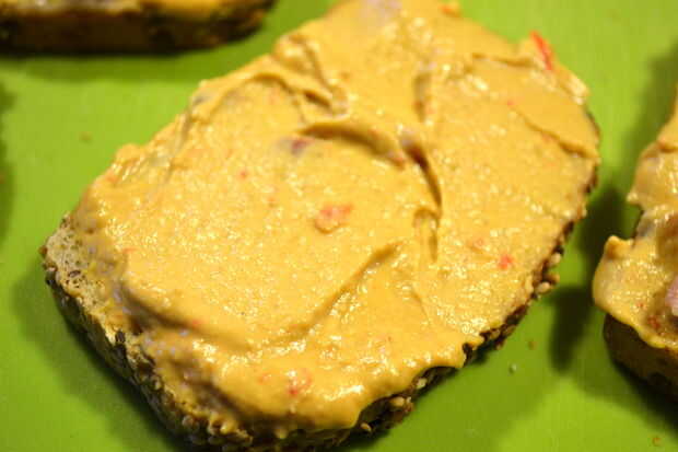 1. empezar con un trozo de pan tostado integral. Puede utilizar baguette francesa para seguir con el tema si quieres. Usé lo que siempre tengo en las manos. Básicamente queremos algo con un crujido a él. Extendió una generosa cantidad de humus sobre él. Me uno con unos pimientos asados pero el tipo más básico funcionaría.