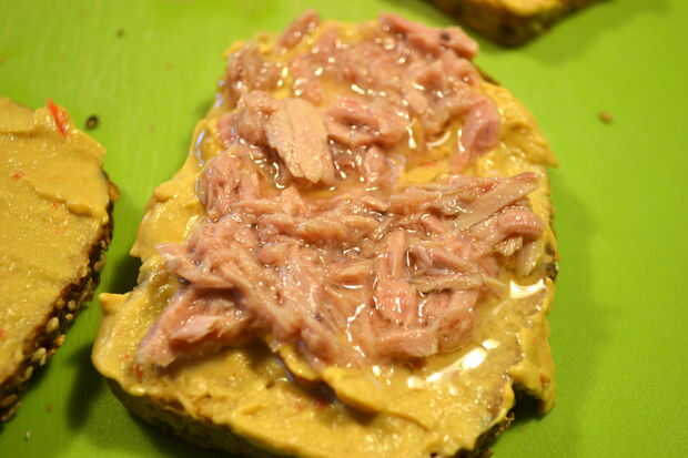 Extendido sobre el hummus algunos trozos de atún. He usado atún de lata y es simplemente delicioso.