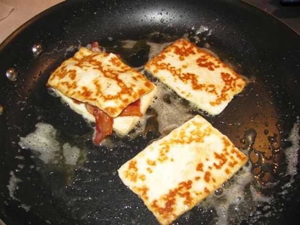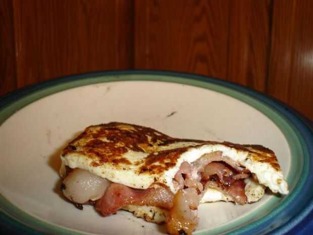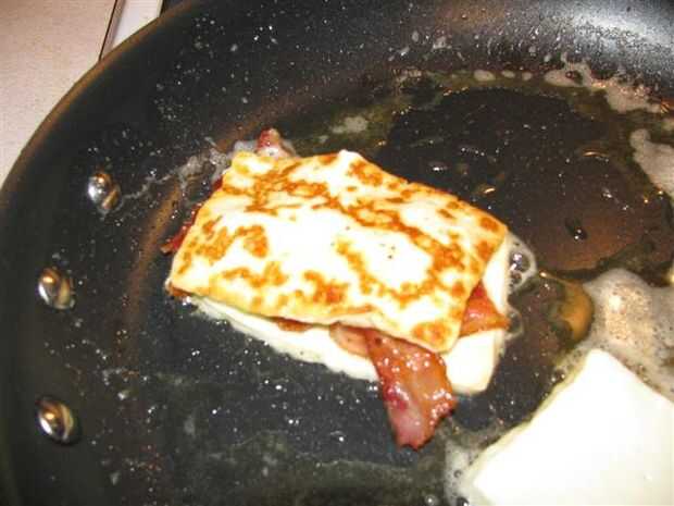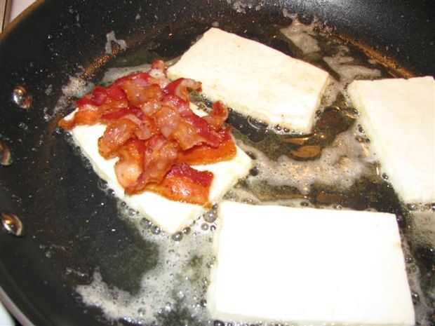 Añadir el tocino a un pedazo del queso y la otra pieza a la pieza de tocino del tirón. Darle un puré lite con su espátula. Cocinar durante 30 segundos más.