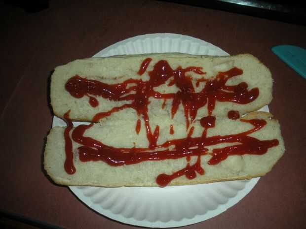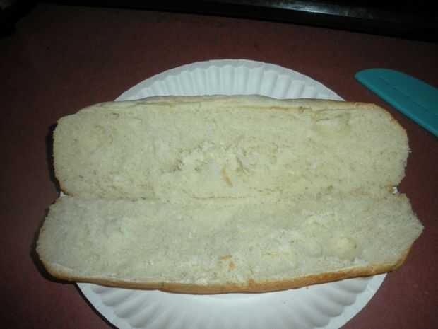 Preparar su rollo, me gustaria dejar una "bisagra" en mi rollo y luego quitar algunos del pan de la "mitad superior" entonces un buen chorrito de combinación de salsa ketchup/hababero (3/4 botella de ketchup de caza) y una botella de salsa caliente del habanero de lagarto atómica