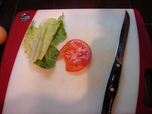Cortar la lechuga y el tomate. No necesitas mucho, sólo lo suficiente para cubrir el pan.