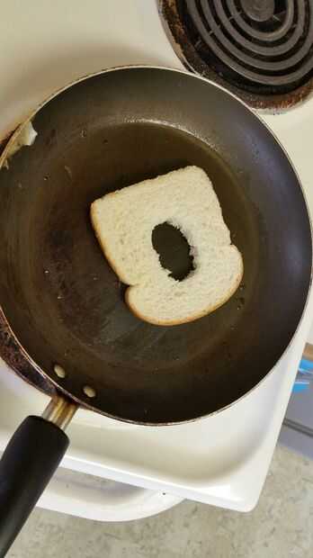 Tallar un agujero algo mayor que una yema de huevo en cada una de las dos rebanadas de pan y colocar en una sartén con un poco de aceite de cocina. Tueste ligeramente cada lado antes de que el siguiente paso. Como alternativa, puede usar una tostadora.