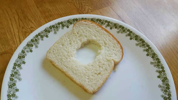 Agujero de técnica - ligeramente el pan de la curva y tomar un bocado considerable del centro. Esto le dará un agujero agradable, simétrico a la yema.