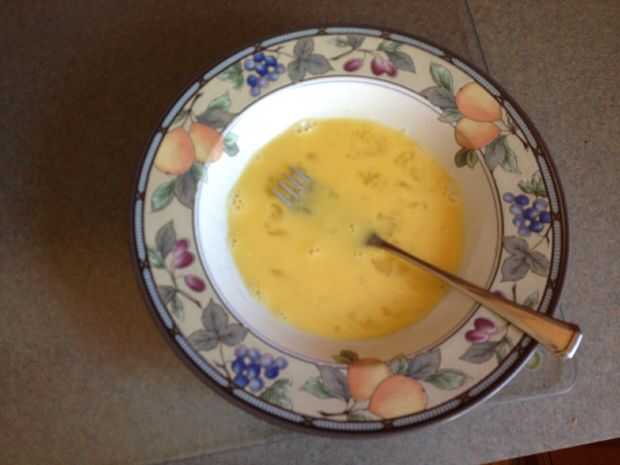 romper dos huevos en un recipiente lo suficientemente grande para el pan y verter una cucharada de leche en ella y en los huevos.