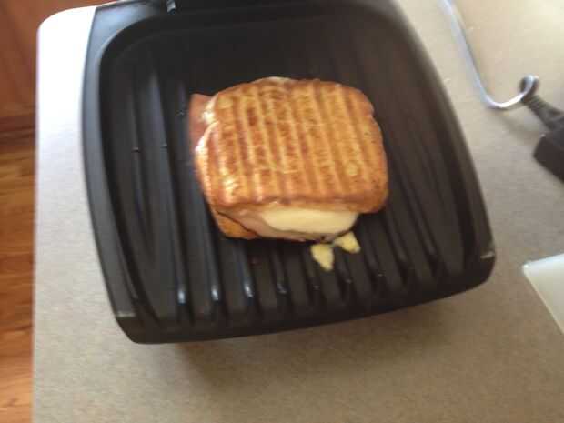 esto es un gran sándwich de desayuno/almuerzo/cena que abarca tres grupos de alimentos de desayuno, huevos, queso y tocino. Este tipo de variación en un "sapo en el agujero" o "huevo en una cesta" y un sándwich de queso a la plancha. E