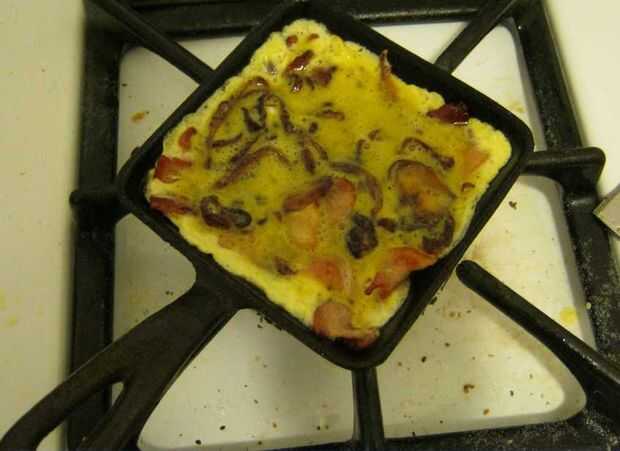 3. Mezclar pimienta y rodajas de cebolla profundo disparó en 1-2 huevos.