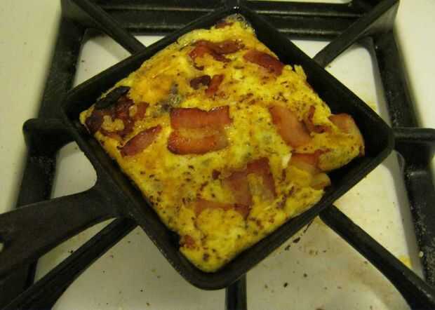 esto es un gran sándwich de desayuno/almuerzo/cena que abarca tres grupos de alimentos de desayuno, huevos, queso y tocino. Este tipo de variación en un "sapo en el agujero" o "huevo en una cesta" y un sándwich de queso a la plancha. E