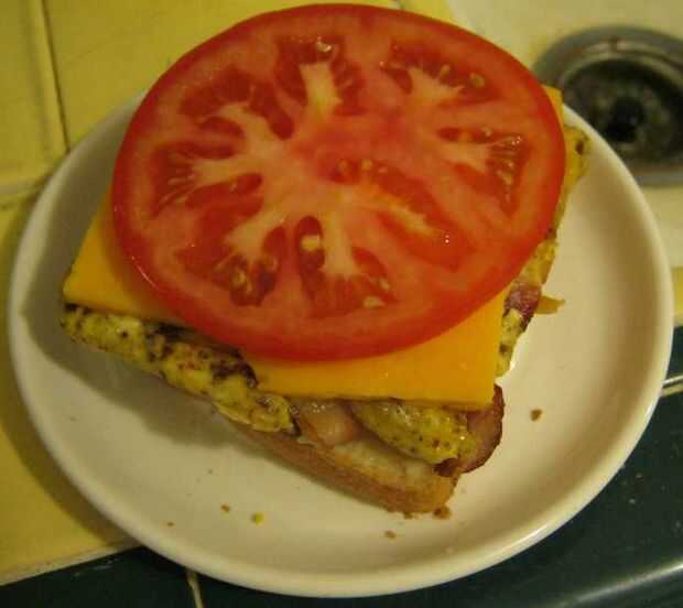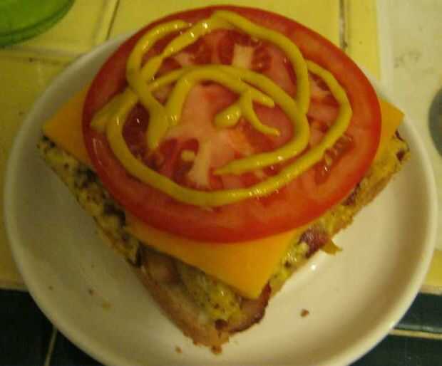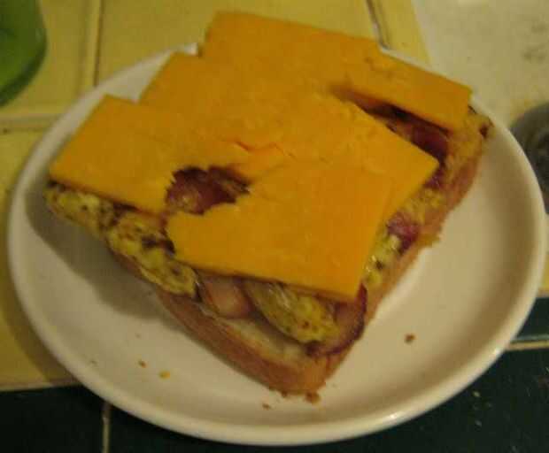 esto es un gran sándwich de desayuno/almuerzo/cena que abarca tres grupos de alimentos de desayuno, huevos, queso y tocino. Este tipo de variación en un "sapo en el agujero" o "huevo en una cesta" y un sándwich de queso a la plancha. E