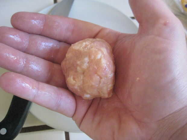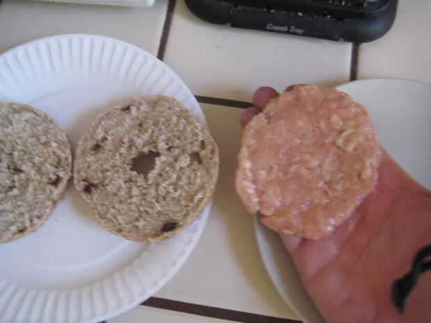 4. roll enlaces de salchicha en bola con la mano, luego aplanar en una empanada del mismo tamaño que su bagel.