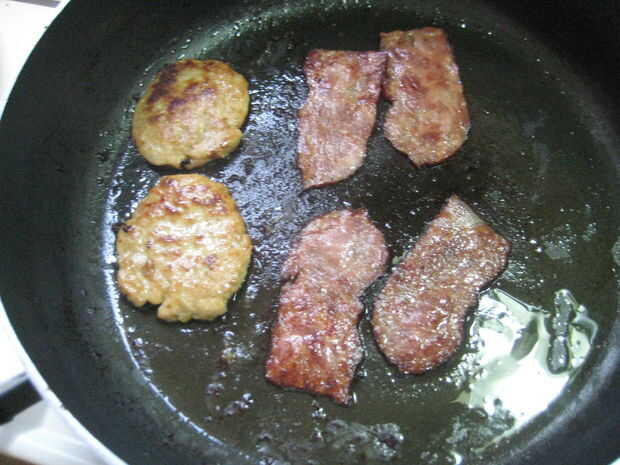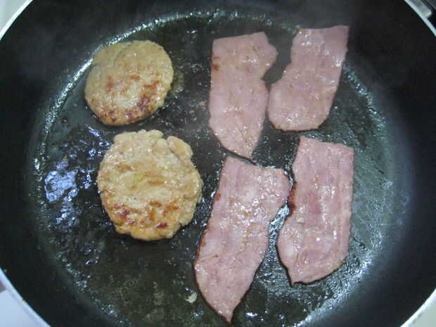 3. salchicha está totalmente cocinada por un lado, voltear y añadir el bacon a la sartén.