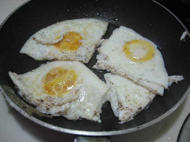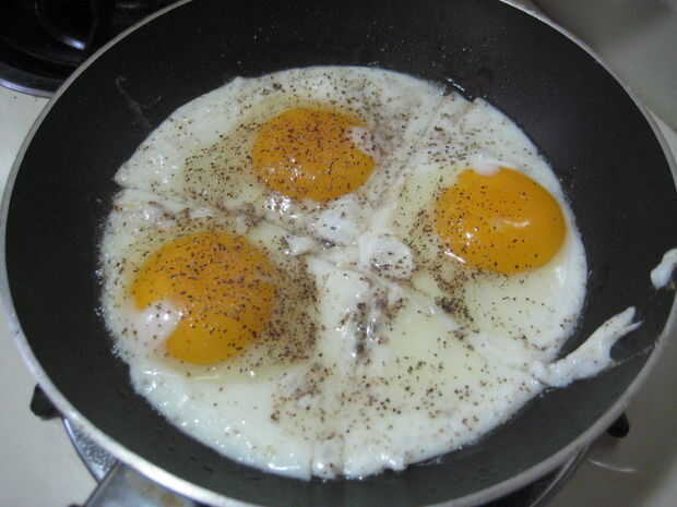 7. freír un lado de los huevos en sartén baja al medio por unos 2 minutos o hasta que las claras de huevo