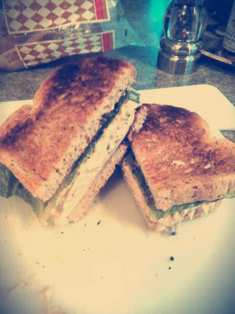 Estos bocadillos de picnic bajo en calorías son perfectos como mediados noche hambre relleno y bueno sirven como sándwiches de té también.Ingredientes:Salsa de menta (Chutney)Tomate en rodajasPepinos en rodajas (si se prefiere de piel)Rebanadas de pa
