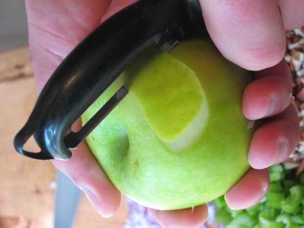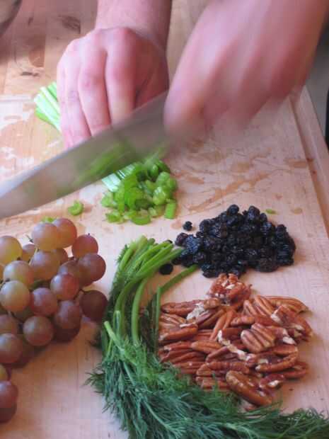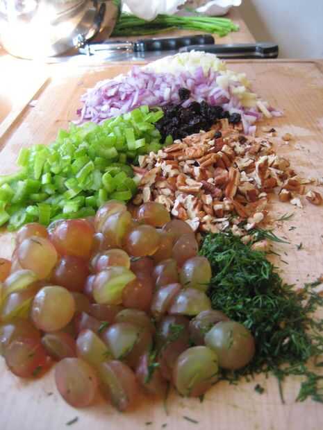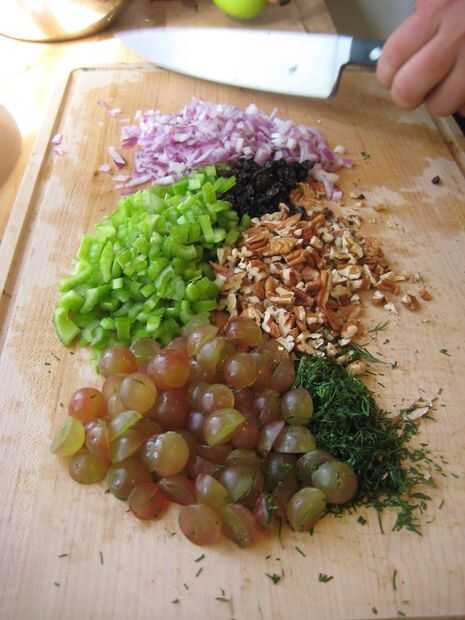 Picar la manzana, la cebolla y el apio a un tamaño pequeño. Uvas conseguirán corte por la mitad, haz picadas nueces y pasas de Corinto y el eneldo obtiene picado.