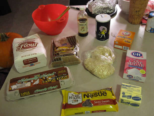 La lista de ingredientes es más o menos el recto hasta la receta de galletas de chispas de chocolate de Toll House de la parte posterior de la bolsa de patatas fritas con una modificación - la adición de algunos avena de cocción rápida absorberá parte de la humedad adicional de la galleta gruesa y añadir algún refuerzo estructural a la cookie en lugar de simplemente agregar más harina blanca. Habiendo hecho estas galletas gigantes con avena y sin ellos, pienso que son un valioso aporte.