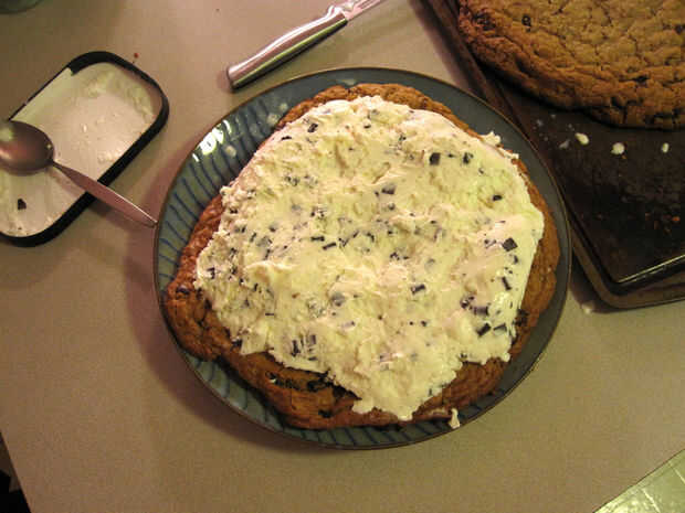Use una punta de espátula de goma para distribuir la crema uniformemente alrededor de la galleta - trabajo rápido - TIC TAC del reloj, el helado se está derritiendo y las cosas sólo están recibiendo más cada día debido al calentamiento global!