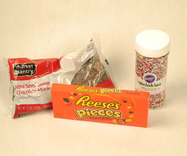 • Decoraciones de elección (yo usé mini chips de chocolate, granas y pedazos de Reese)