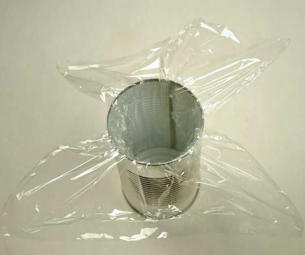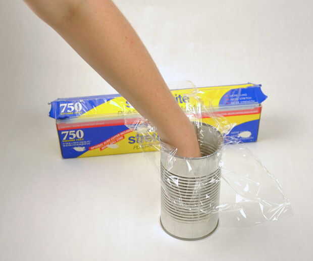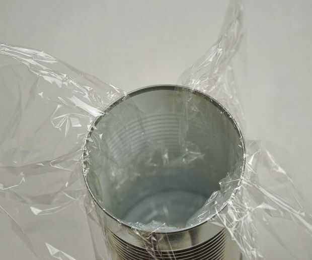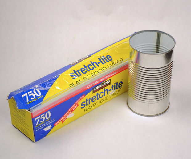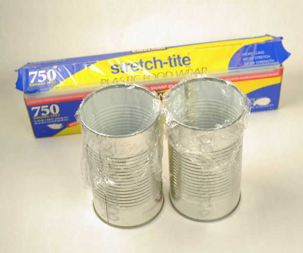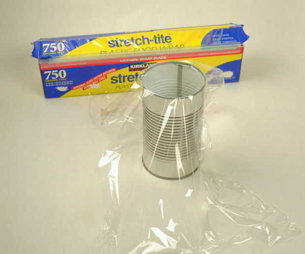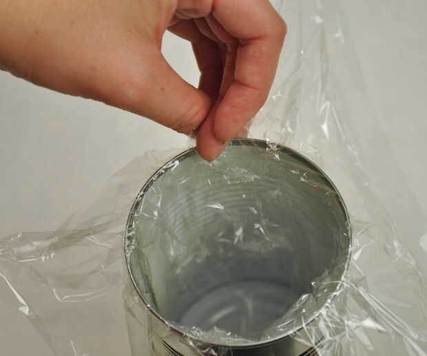 Corte un pedazo de envoltura transparente que es más de dos veces la altura de la lata. Póngala sobre la apertura de la can y con el centro de la envoltura se aferran en el centro de la abertura de la lata. Empuje hacia abajo tratando de mantener los lados incluso. Empuje completamente hacia abajo. Ahora intenta superponer las partes no veo la puede meter por medio. Debe tener abrigo extra se aferran colgando sobre los lados fuera de la lata.