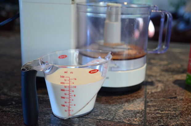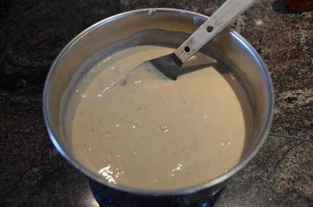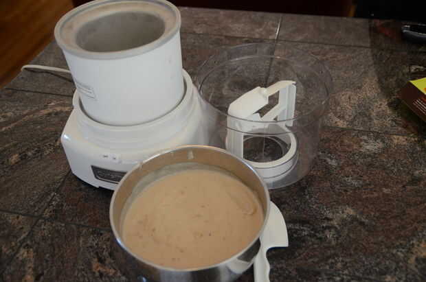 4. enfríe la mezcla en el refrigerador durante al menos 2 horas y luego congele según las instrucciones de su fabricante de helado. Mientras que la masa es escalofriante, te puedes preparar la costra de galleta.