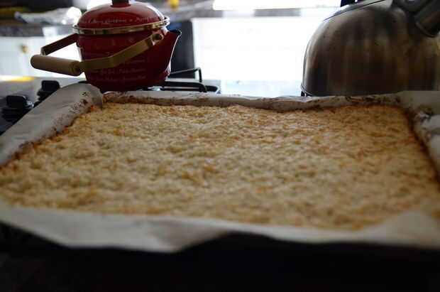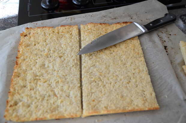 7. poner la corteza de la hoja de la hornada en una tabla de cortar y luego cortar dos piezas iguales para las capas superior e inferior de la barra.