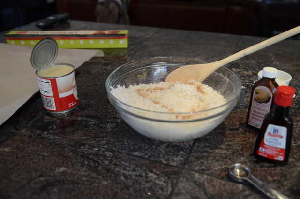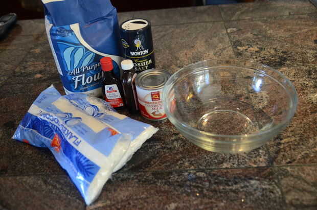 2. en un tazón grande, mezcle la harina, el coco y la sal.