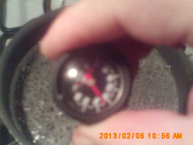En una pequeña salsa pan relleno withwater acerca de una pulgada y media de alto.