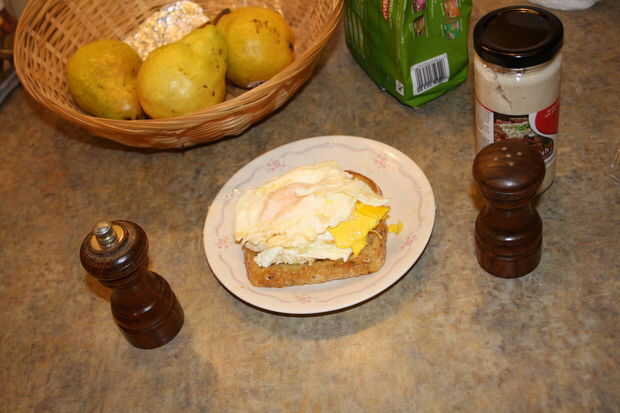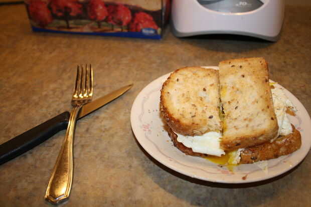 Poner el otro trozo de halfbreadtoast sobre los huevos, la parte tostada hacia abajo. Cortar por la mitad! Se ve mejor y es más fácil. Me gusta comer con un tenedor y cuchillo a porque es un poco de mantequilla.
